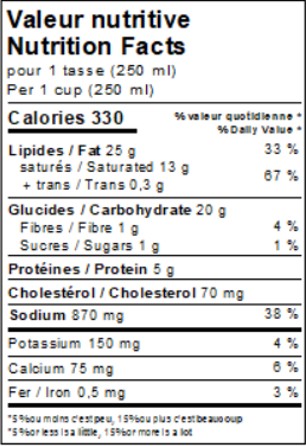 Eau, Pommes de terre, Crème 35 % M.G. (lait), Oignon frit (huile de colza), Pommes de terre déshydratées (pommes de terre (séchées), mono et diglycérides, pyrophosphate acide de sodium, acide citrique, BHA), Beurre non salée (lait), Morceaux de bacon cuits (porc, eau, sucres (sucre, cassonade), sel, vinaigre, concentré de jus de citron, poudre de céleri de culture, phosphate de sodium, chlorure de potassium, saveur, érythorbate de sodium, nitrite de sodium, épices, fumée), Fromage cheddar (lait), Huile de canola, Amidon de maïs modifiée, Sel, Arôme naturel (lait), Épices, Bêta-carotène, Poivre de cayenne rouge vieilli, Vinaigre distillé.
