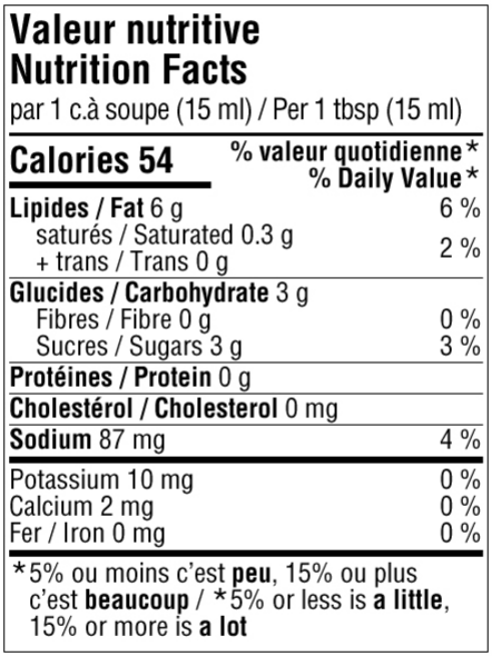 Ingrédients: Huile de canola, Eau, Sucres (sucre blanc, miel), Vinaigre, Épices (moutarde), Sel, Légumes déshydratés (oignon), Gomme de xanthane, Benzoate de sodium, Sorbate de potassium.