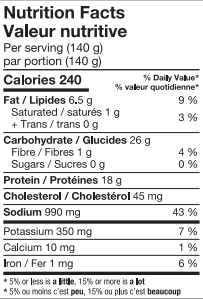 Chicken breast meat, Water, Coating (wheat flour, toasted wheat crumb, spices, salt, baking powder, garlic powder, caramel, onion powder, vegetable oil), Batter (water, wheat flour, corn flour, rice flour, potato starch, salt, baking powder, caramel, flavour, spices, guar gum, garlic powder, vegetable oil), Pre-coating (toasted wheat crumbs, wheat flour, wheat gluten, egg white powder, baker’s yeast, citric acid), High oleic low linolenic canola oil, Glucose solids, Marinating spices (salt, modified corn starch irradiated dehydrated onion, dehydrated garlic, spices, mfg aids [silicon dioxide, polysorbate 80]), Salt, Soy protein, Arrowroot starch, Potassium chloride.