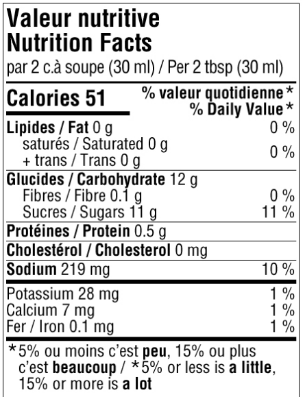 Ingredients: Sugar (white sugar, brown sugar, apple purée), Water, Soya sauce (water, wheat, soy, salt, sodium benzoate, starter agent (aspergillus sojae), Vinegar, Modified corn starch, Hydrolyzed soy protein (hydrolyzed soy protein, salt, canola oil), Garlic, Spices, Sesame oil, Natural flavour, Dehydrated vegetables (garlic, onion), Citric acid, Caramel (sulphites), Sesame seeds, Sodium benzoate, Potassium sorbate.