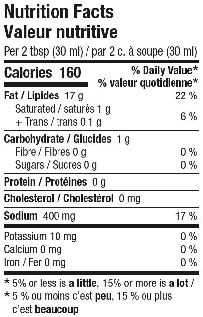 Canola oil, Water, Vinegar, Monosodium glutamate, Salt, Citric acid, Spices, Xanthan gum, Potassium sorbate, Sodium benzoate, Calcium disodium EDTA.