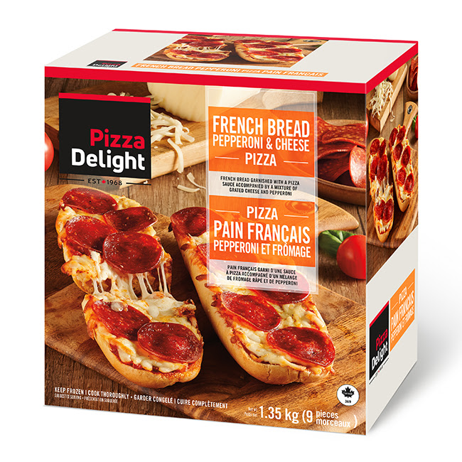 Mixed cheese: Parmesan (pasteurized milk, salt, bacterial culture, calcium chloride, microbial enzyme, lipase, cellulose, natamycin), Mozzarella cheese (water, palm and/or interesterified soybean oil, casein [milk protein], modified potato starch, salt, whey, corn starch,sodium aluminum phosphate, sodium phosphate, lactic acid, natural flavour, sorbic acid [as a preservative], turmeric, annatto extracts), Oil, Xanthane, Yeast extract, Irradiated dehydrated garlic, Dehydrated onion, Salt, Herbs, Xanthan gum, Pepperoni (pork and/or beef, salt, mustard, sugars [dextrose], spices, sodium erythorbate, garlic powder, bacterial culture, sodium nitrite, citric acid).Contains: Wheat, Wheat gluten, Milk, Mustard.