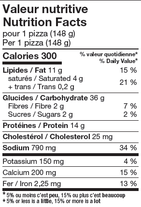 Sugar, Salt, Canola oil, Vinegar. Toppings: Mozzarella and/or part-skim mozzarella cheese (modied milk ingredients, bacterial culture, salt, calcium chloride, microbial enzyme), Sauce (water, tomato paste, canola oil, salt, sugar, herbs, dehydrated garlic, spices), Pepperoni, Red Peppers, Mushrooms.Contains: Wheat, Milk. May contain: Soy.