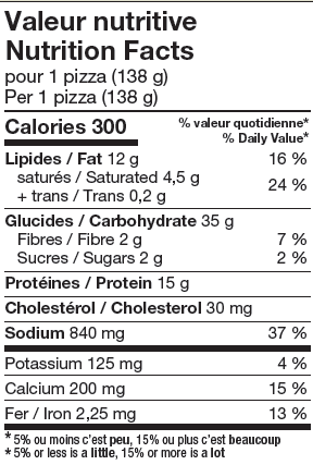 Sugar, Salt, Canola oil, Vinegar. Toppings: Mozzarella and/or part-skim mozzarella cheese (modied milk ingredients, bacterial culture, salt, calcium chloride, microbial enzyme), Sauce (water, tomato paste, canola oil, salt, sugar, herbs, dehydrated garlic, spices), Pepperoni, Bacon.Contains: Wheat, Milk May contain: Soy