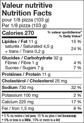 Crust: Enriched wheat flour, Water, Mozzarella cheese (pasteurised milk, modified milk ingredients, bacterial culture, salt, calcium chloride, microbial enzyme, powdered cellulose), Canola oil, Sugar, Yeast, Modified corn starch, Palm and canola oil shortening, Salt, Baking powder, Extra virgin olive oil, Dough conditioners (enzymes, ascorbic acid), Citric acid, Gum blend (xanthan, guar, sodium alginate).