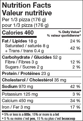 Garnitures: Fromages mozzarella et parmesan (lait partiellement écrémé, lait, substances laitières modifiées, culture bactérienne, sel, chlorure de calcium, enzyme microbienne, lipase, cellulose en poudre), Tartinade à l’ail (margarine de soja non hydrogénée, eau, ail déshydraté, sel, persil, acide citrique).