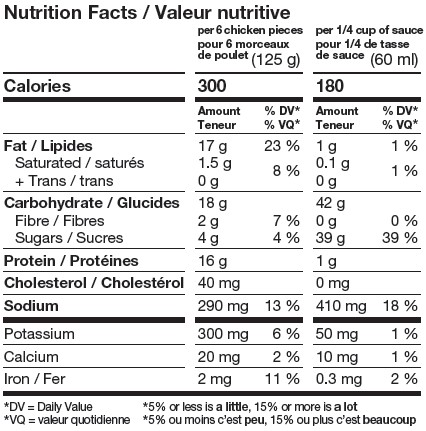 Sauce: Sucres (sucre, jus d’ananas concentré), Eau, Sauce hoisin (sucre, eau, fèves de soya, sel, patate douce, amidon de maïs modifié, graines de sésame, ail, farine de blé, piment fort, épices, caramel, acide acétique, rouge allura, sorbate de potassium), Vinaigre, Sauce soya (eau, blé, soya, sel, benzoate de sodium), Ail, Gingembre, Sauce soya noire aromatisée aux champignons (sauce soya, caramel, sucre, arôme naturel et artificiel, inosinate disodique, guanylate disodique, benzoate de sodium), Huile de canola, Amidon de maïs modifié, Épices, Poivron rouge, Extrait de levure, Gomme xanthane.
