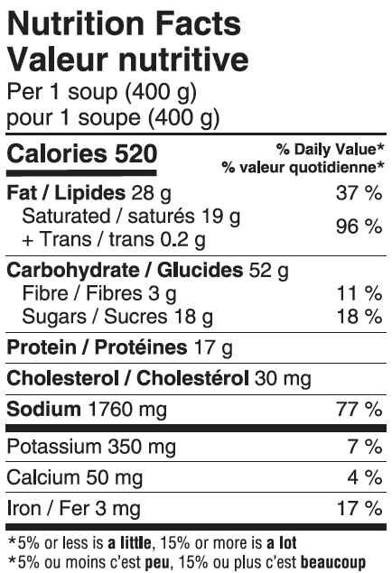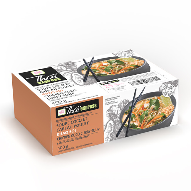 Eau, Lait de coco (lait de coco, eau, polysorbate 60, gomme de guar, acide citrique, métabisulfites de sodium), Nouilles (farine de blé enrichie, eau), Carotte, Poulet, Sucre, Sauce poisson (extrait d’anchois, sel, sucre), Chou kale, Poivron rouge, Huile de canola, Oignon vert, Amidon de maïs modifié, Ail, Pâte de cari rouge (ail, chili rouge broyé, citronnelle, échalotes, sel, galanga, pâte de crevette (pâte de crevette, sel), kaffir, poivre), Pâte de cari jaune (ail, citronnelle, sel, échalote, galanga, chili rouge broyé, épices, kaffir), Gingembre, Fines herbes, Épices, Feuilles de citronnier kaffir, Base de bouillon de poulet (sel, glutamate monosodique, extrait sec de sirop de maïs, poulet cuit séparé mécaniquement et déshydraté, amidon de maïs, gras de poulet, protéine de soya/maïs/blé hydrolysée, sucre, silicate de calcium, arôme naturel et artificiel, extrait de levure, inosinate disodique, guanylate disodique, épices, substances laitières modifiées, chlorhydrate de cystéine, colorant, acide citrique, oignon, acide succinique).