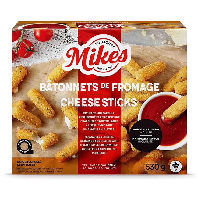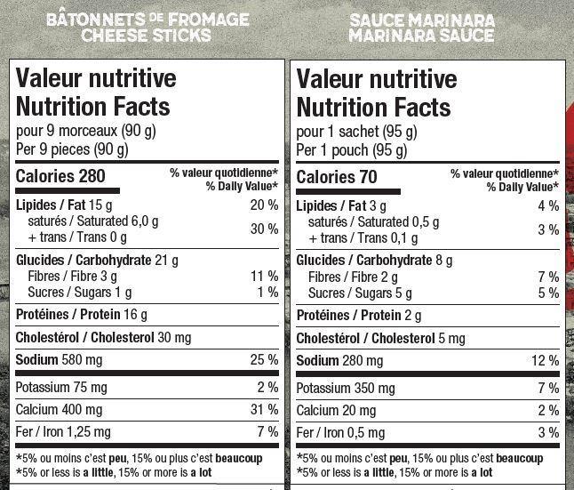 Bâtonnets de fromage: Fromage pizza mozzarella (lait pasteurisé, substances laitières modifiées, culture bactérienne, sel, chlorure de calcium, enzyme microbienne), Chapelure de blé grillé avec épices et fromage romano, Eau, Pâte à frire (farine, amidon de maïs, blanc d’œuf en poudre, sel, gomme de xanthane), Sel, Épices, Acide sorbique.