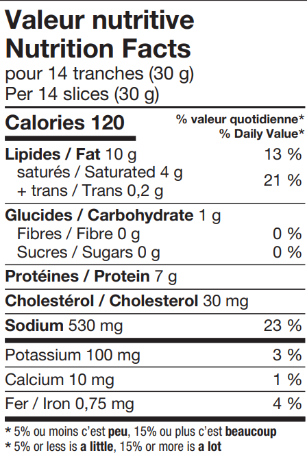 Ingrédients: Porc et/ou Bœuf, Sel, Épices (incluant moutarde), Sucres (dextrose), Érythorbate de sodium, Ail en poudre, Culture bactérienne, Nitrite de sodium, Acide citrique.