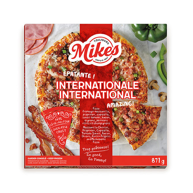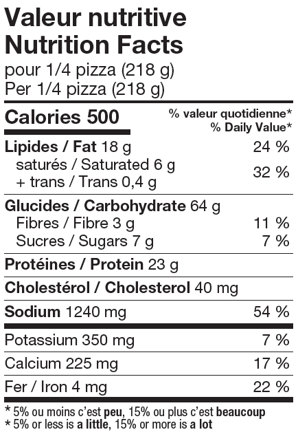 Garnitures: Sauce (tomates, eau, huile de canola, sucre, sel, épices [ail déshydraté]), Fromage mozzarella (lait pasteurisé, substances laitières modifiées, culture bactérienne, sel, chlorure de calcium, enzyme microbienne), Pepperoni (porc, eau, fécule de tapioca, farine de blé, sel, épices, sucres [sucre, dextrose], phosphate de sodium, érythorbate de sodium, ail en poudre, saveur de fumée naturelle, oléorésine de paprika, nitrite de sodium), Capicollo (porc, eau, sel, phosphate de sodium, carraghénine, sucre, érythorbate de sodium, ail en poudre, épices, nitrite de sodium), Bacon, Champignons, Poivrons verts, Oignons.