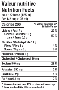 Eau, Crème (crème, lait, dextrose, carraghénine), Tomates broyées, Tomates en dés (tomates, jus de tomates, acide citrique, chlorure de calcium), Amidon de maïs modifié, Beurre, Sucre, Ail, Sel, Fines herbes, Fromage romano, Jus de citron concentré, Ail déshydraté, Poivre noir, Acide citrique.