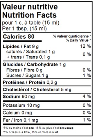 Huile de canola, Huile de sésame, Moutarde de Dijon (eau, graines de moutarde, vinaigre, sel, vin blanc, acide citrique, acide tartrique, curcuma, épices), Vinaigre de riz, Eau, Sucre, Sauce soya (eau, blé, fèves de soya, sel, benzoate de sodium), Jaune d’oeuf liquide, Échalote française, Ail, Sel, Gomme xanthane, Benzoate de sodium, Sorbate de potassium, Poivre noir, Poudre d’ail, EDTA de calcium disodique.