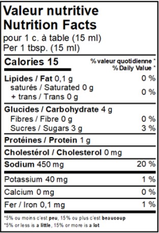 Sauce soya (eau, fèves de soya, blé, sel), Eau, Sucre, Poudre d’ail, Sel, Acide citrique, Benzoate de sodium.